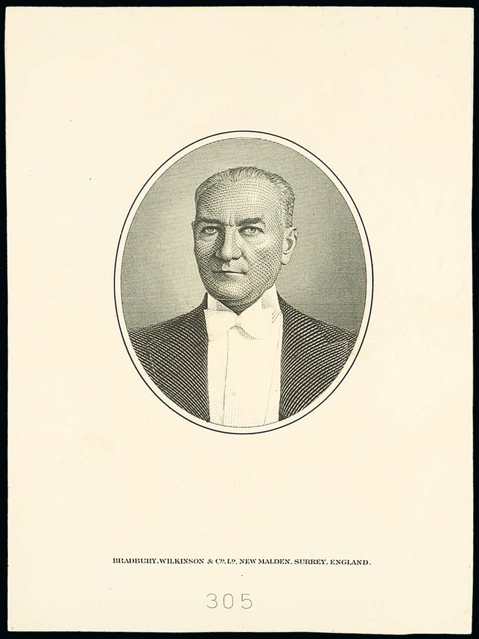 Mustafa Kemal Atatürk, large head and shouders within double-lined oval (80mm x 107mm), die number "3052 below, fine. Photo