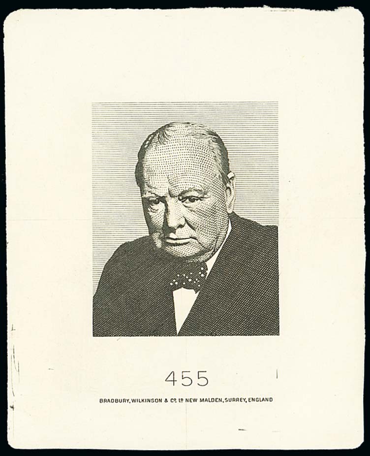 1965 Sir Winston Churchill, four similar head and shoulder designs, two large, one with horizontal background lines and die number "455", the other with manuscript "455", and two smaller, one with die number "443" below. Fine. Photo