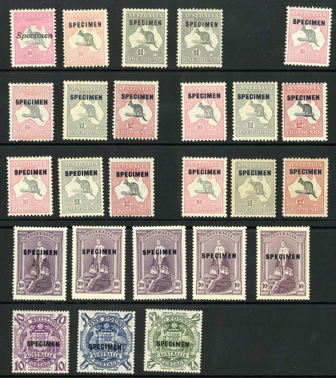 1913-56 selection including 1931-36 10/-, £1 and £2 (four sets), 1937-49 10/- dull purple (5) and 1948-56 10/- to £2 each overprinted "specimen", large part original gum to unmounted mint, a few minor imperfections, generally fresh and fine. S.G. between 14s and 224ds, £680+