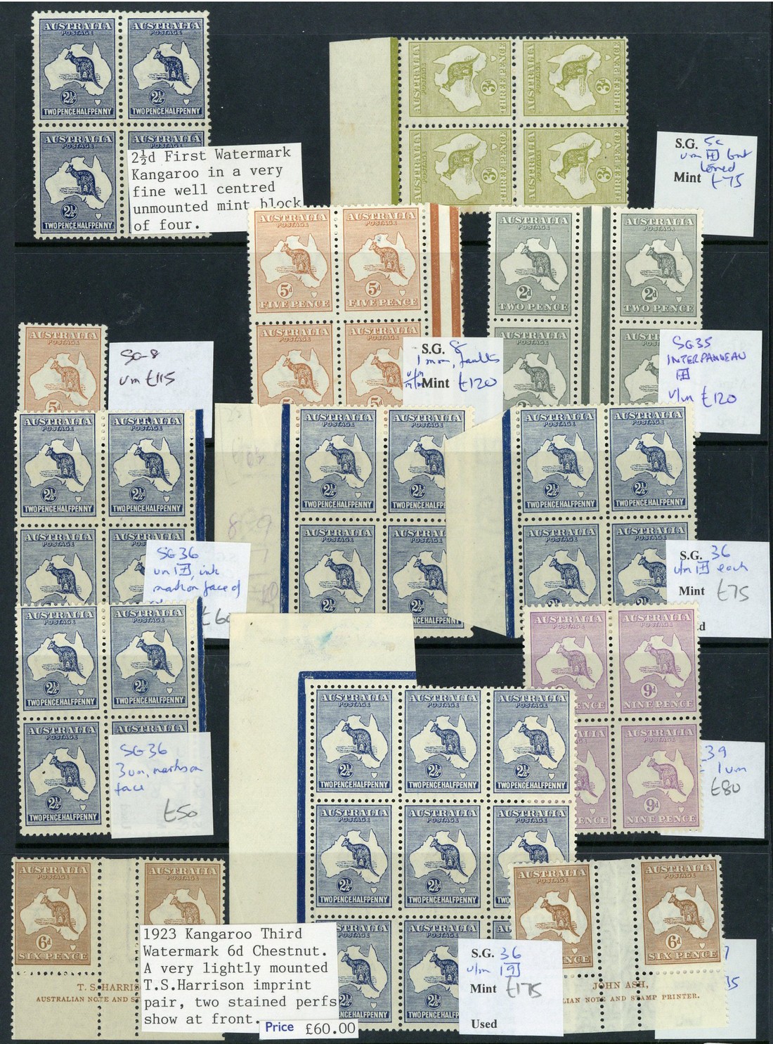 1913-36 selection of mint Kangaroo issues (79) on stockpages, including 1913-14 2½d. well centred block of four, 3d. block of four from the top of the sheet, 5d. block of four from the right of the pane, 1915-27 2½d. blocks of four (4) and a block of nine, 9d. block of four, 1923-24 6d. imprint pair, 1929-30 6d. imprint pair, imprint block of four, 9d. imprint pair, 5/-, Official 1915-28 3d. and 1/- blocks of four, 1923-24 6d. block of four, etc., chiefly good to fine