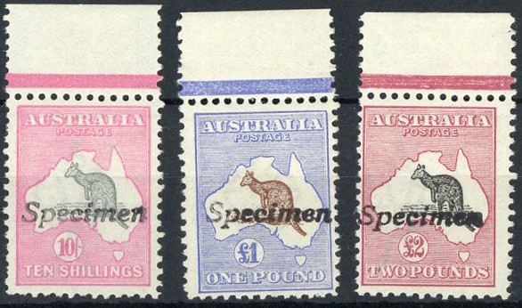 1913-14 10/-, £1 and £2 each marginal from the top of the sheet and handstamped "Specimen", fresh and fine unmounted mint. S.G. 14s-16s, £1,100