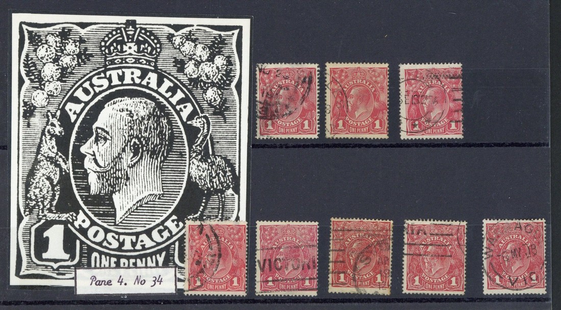 1914-20 1d. substituted clichés, S.G. 21cb (2), 21db (3), 1916-18 1d. substituted clichés S.G. 47ba (5), S.G. 47ia (5), used; chiefly fine and many Ex Davidson. S.G. £1,050
