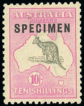10/- grey and pink overprinted "specimen", original gum, well centred and scarce. S.G. 43s, BW 48xb, $A2,500. Photo