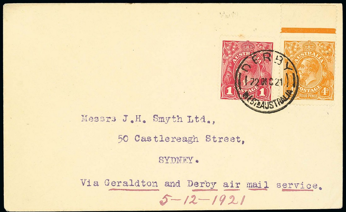 1921 (22 Dec.) envelope from Derby to Sydney franked at 5d., endorsed "Via Geraldton and Derby air mail service" and intended for the ill-fated first flight though actually carried on the 2nd. flight (first flight of the regular service); tiny stain at top of the 1d., fine and scarce. Photo