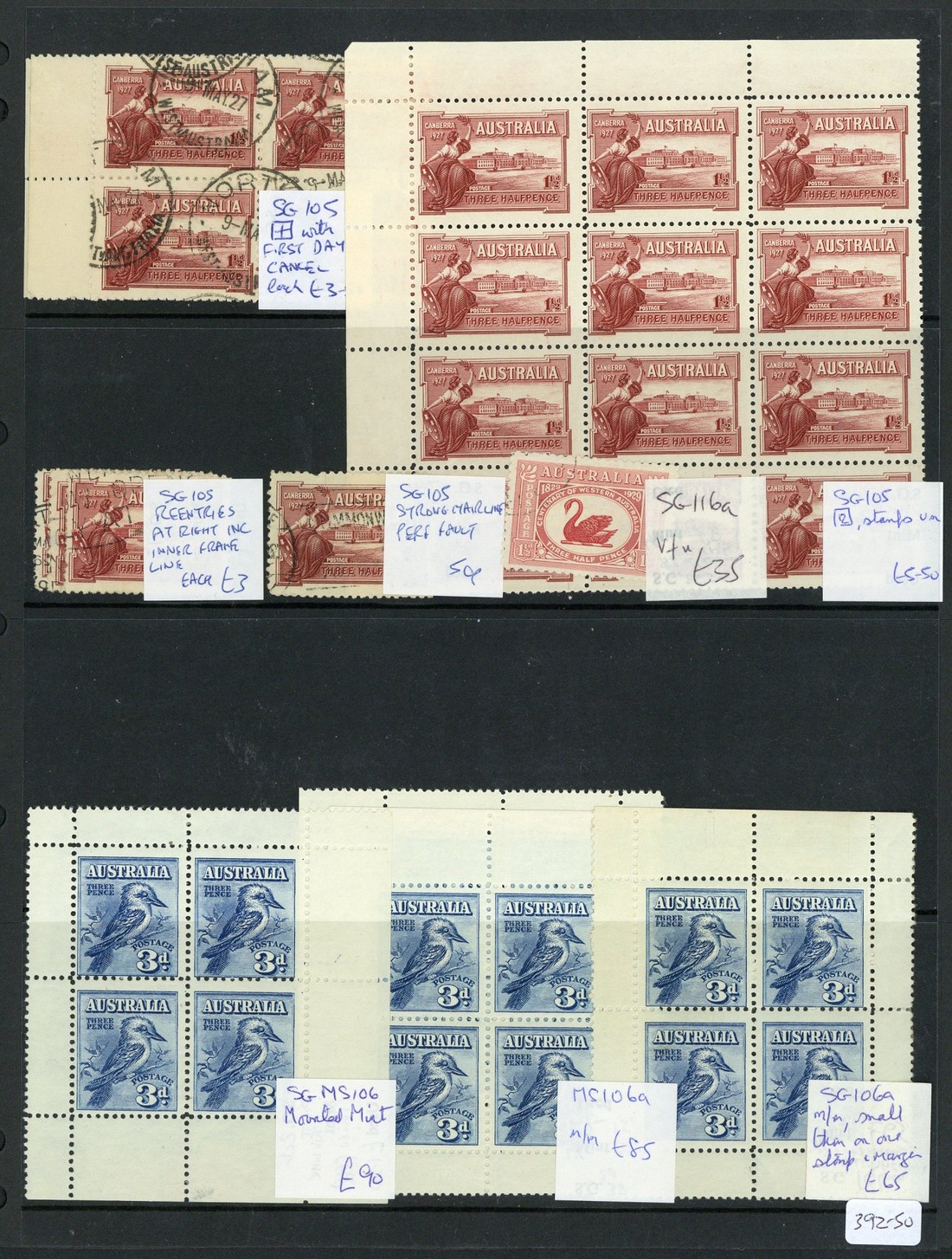 1927-40 duplicated mint and used selection of Commemorative issues on stock pages, including 1928 Melbourne miniature sheet (4), 1929 Western Australia 1½d. Plate number blocks 1-8, 1930 Sturt 1½d. Plate number blocks 1-8, 1931 Kingsford Smith Air 6d. violet re-entry (6 with two in imprint blocks of eight), 1931 Air 6d. imprint block of twenty, 1932 Bridge 3d. Plate number blocks 1-4, 1934 Macarthur 2d. Dark Hills Imprint pair and block of four, set in imprint blocks, etc., chiefly fine. (hundreds)