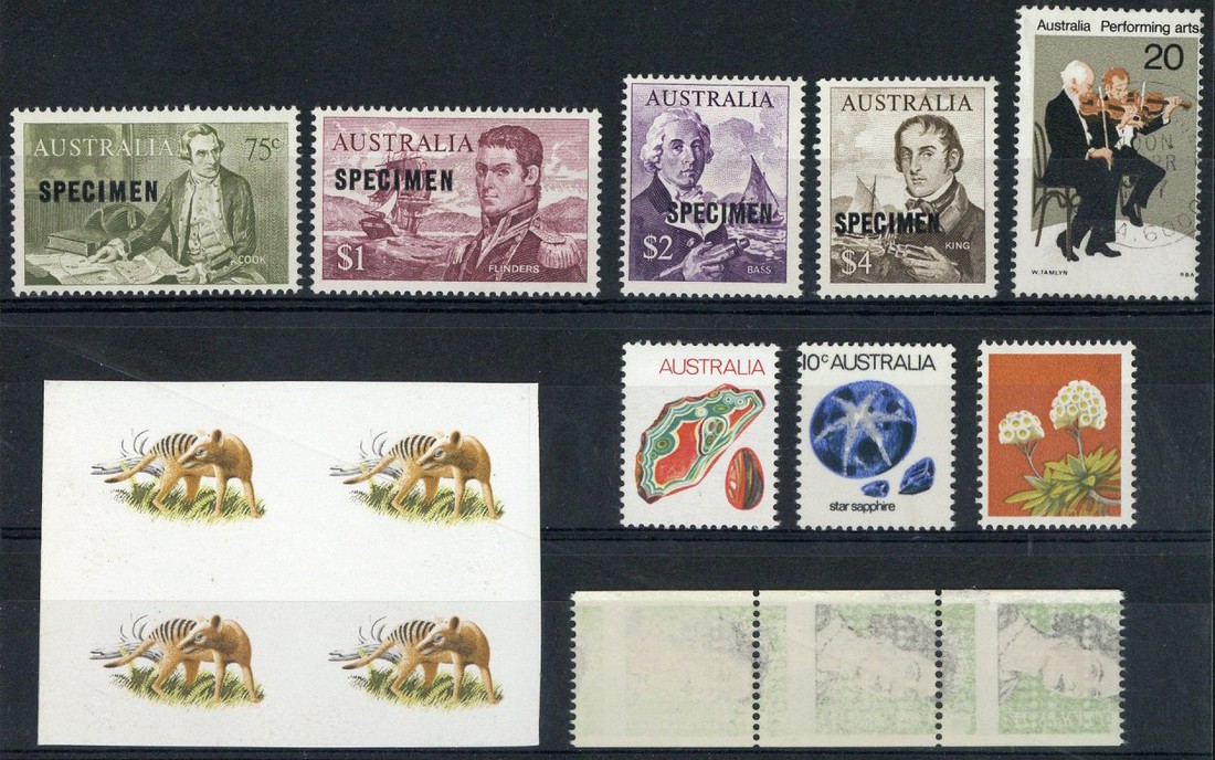 1966-73 Decimal Navigators 75c. to $4 overprinted "specimen", 1966-67 coil 3c. strip of three with colours offset on reverse, 1973-74 7c. agate black omitted, 10c. Star Sapphire printed on the gummed side, 1975 Flowers 18c. black omitted, 1977 Performing Arts 20c. on brilliant white paper (used), 1981-83 Wildlife 24c. proof block of four of the centre; chiefly fine unmounted mint