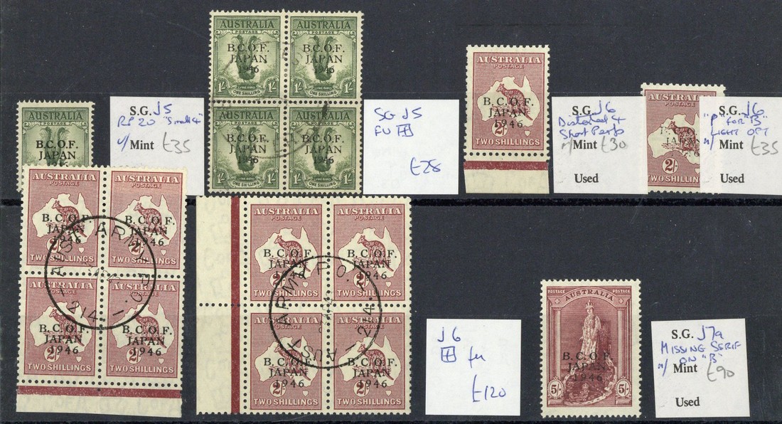 A mint and used selection (16), including 1/- used block of four, 2/- (2) used block of four, 5/- mint, minor varieties, etc., fine. S.G. J5, 6, 7a, £830