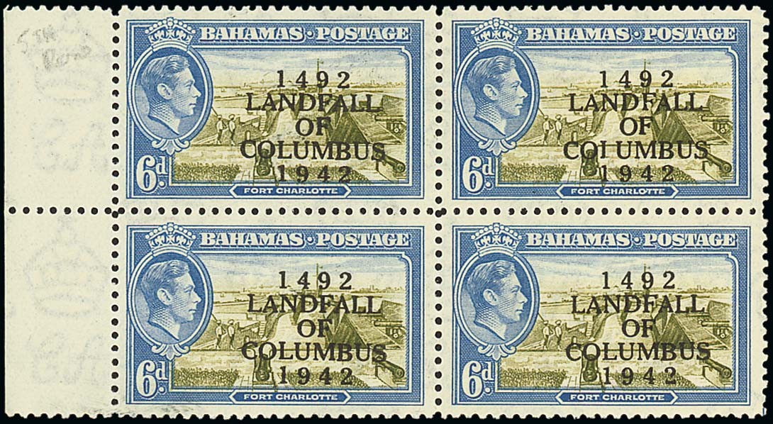 1942 Columbus 4d. light blue and red-orange, 6d. olive-green and light blue blocks of four, one in each, each showing error "coiumbus", original gum, the errors both unmounted mint, a trifle gum toned otherwise fine and rare positional blocks. S.G. 168a, 169a, £2,200+. Photo