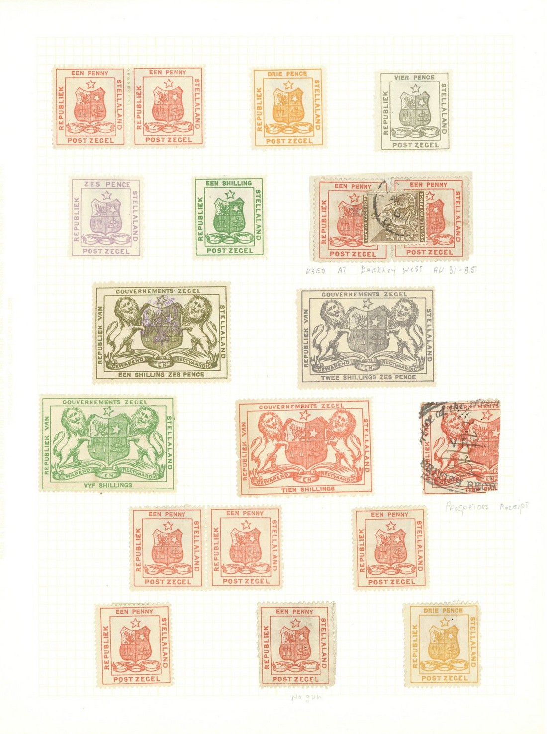 A selection comprising 1d. (7 with two pairs), 3d. (2), 4d., 6d. and 1/-, part to large part gum except one 1d., 1d. pair on fragment with Cape 2d. affixed over and cancelled by Barkley West c.d.s., and Revenue 1/6d., 2/6d., 5/- and 10/- mint, and 10/- (half) used