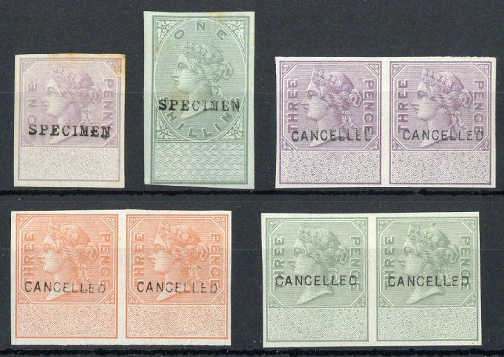 3d. horizontal pairs in lilac, green and orange, each overprinted "cancelled" (GB14); fine. Also 1d. and 1/- (both with stains) overprinted "specimen" (GB9)