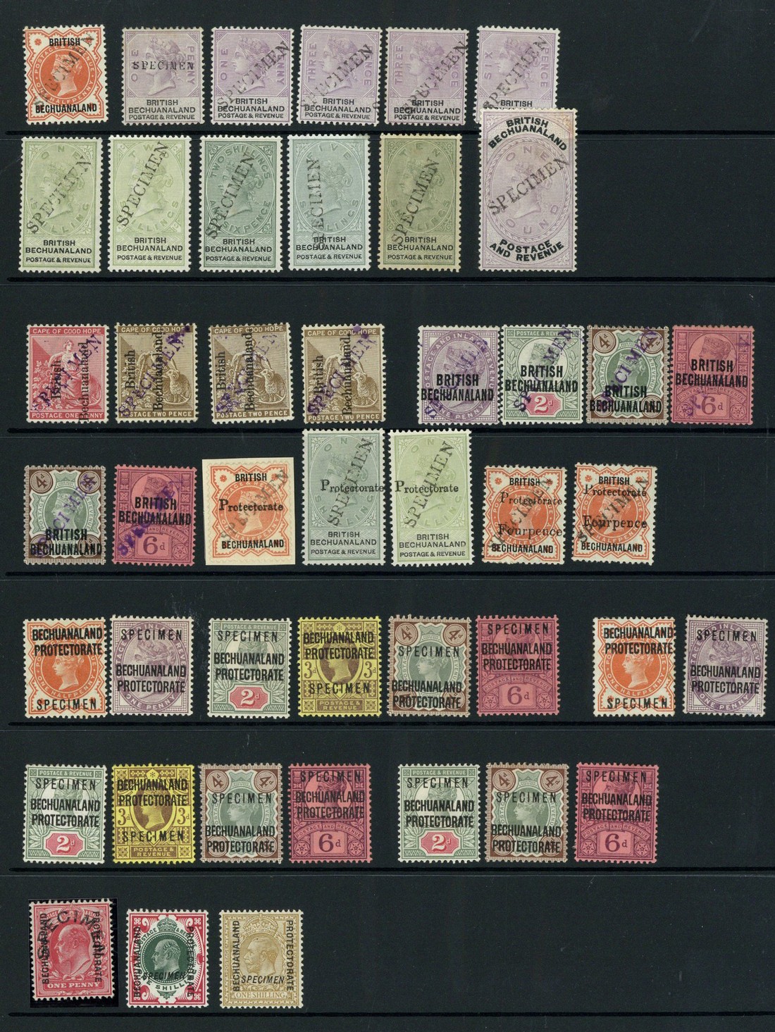 1888 ½d. vermilion, values to £1, 1891 (Nov.) 1d. and 2d. (3), 1891-1904 1d. to 4d. (2) and 6d. (2); Bechuanaland Protectorate selection (53) including 1888 ½d. vermilion, 1/- green and black (2), 1904-13 1/- green and carmine, 1932 ½d. to 10/- in marginal pairs from the left of the sheet (surface damage on 4d. and 2/6d.), 1937 Coronation set and 1932-58 Postage Dues each overprinted or perforated "specimen", part original gum to fine unmounted mint, a few without gum, some minor faults, generally fresh and sound. S.G. between 10s and D6s, £865+