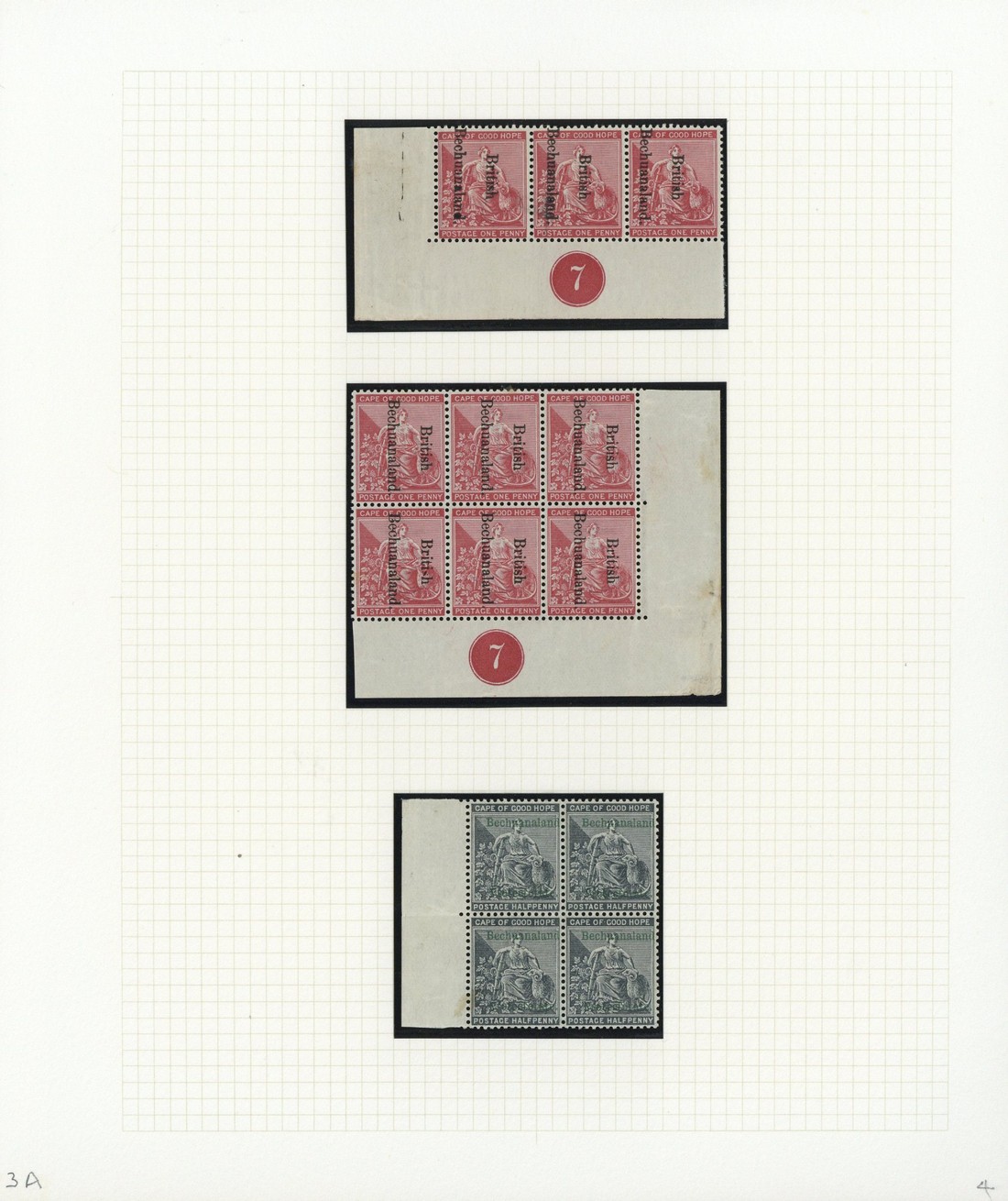 1888 (Dec.) ½d. on 3d. and 1888 (27 Dec.)-95 complete with a few blocks of the on Cape values and 1893-95 1d. with "c" of "Bechuanaland" largely missing; the first with gum a little toned though generally good to fine