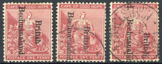 1d. carmine-red, variety no dots to "i" of "British", mint (trace of foxing at top) and used, and a further used example showing overprint misplaced to foot, neatly cancelled by Francistown c.d.s. S.G. 38e, £300+