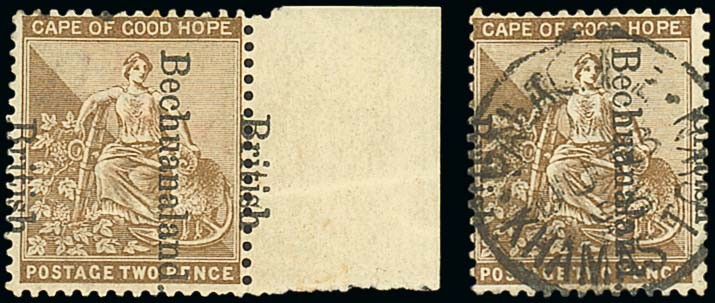 2d. bistre (2), both variety "Bechuanaland British", one marginal from the right of the sheet with part gum (toned) and with horizontal crease, the other used with Palachwe Khamas Town 1896 c.d.s., sound. S.G. 39d, £800. Photo