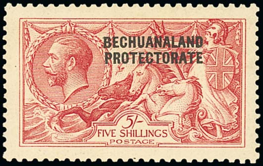 Waterlow 5/- carmine-red (a shade unlisted by S.G.) variety overprint double, one albino, fresh mint. S.G. 84a, var. Photo