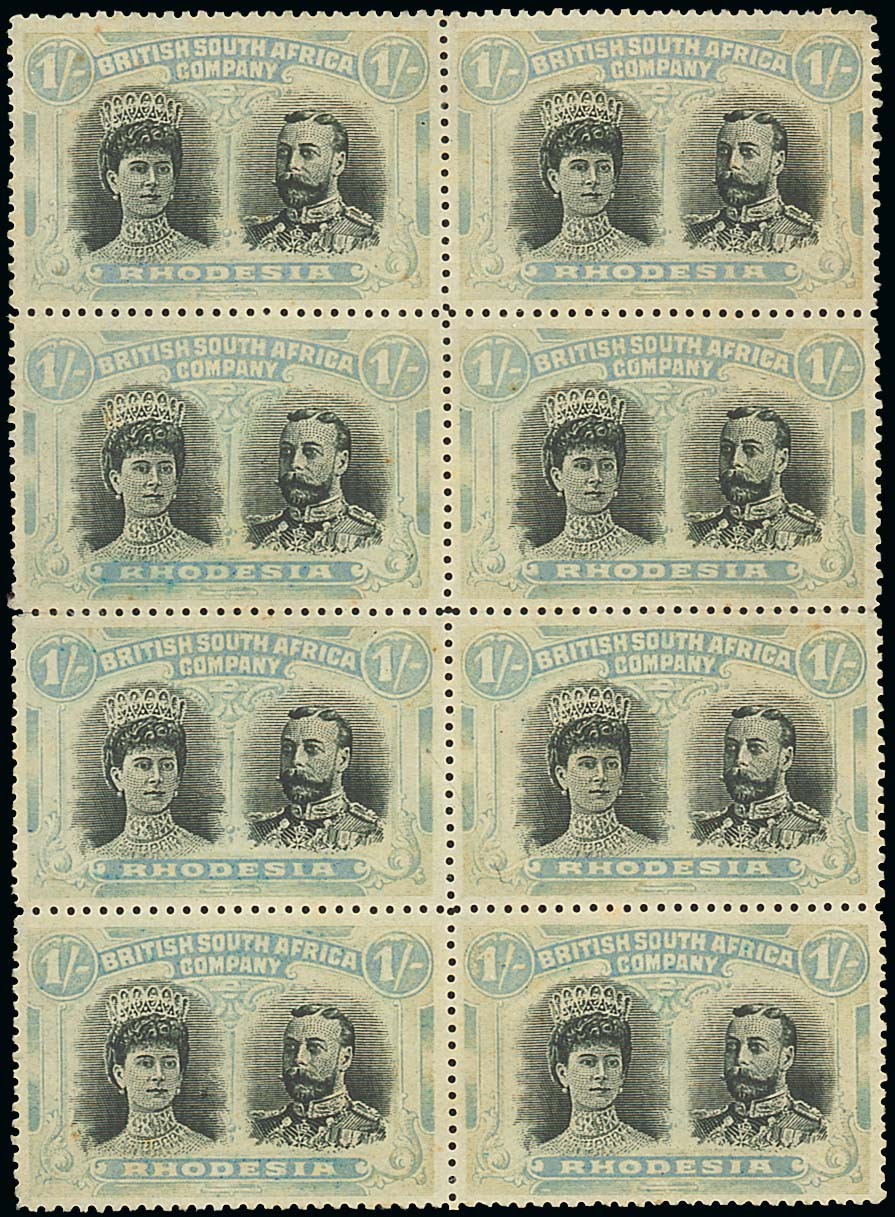 1/- black and pale turquoise-blue block of eight (2x4), [NG4-20], [NG5/10/15/20] with Medal cuts, large part original gum; folded between horizontally at centre; a few faint tone marks. A scarce large multiple of this printing. B.P.A. Certificate (2002). RSC "F". Photo