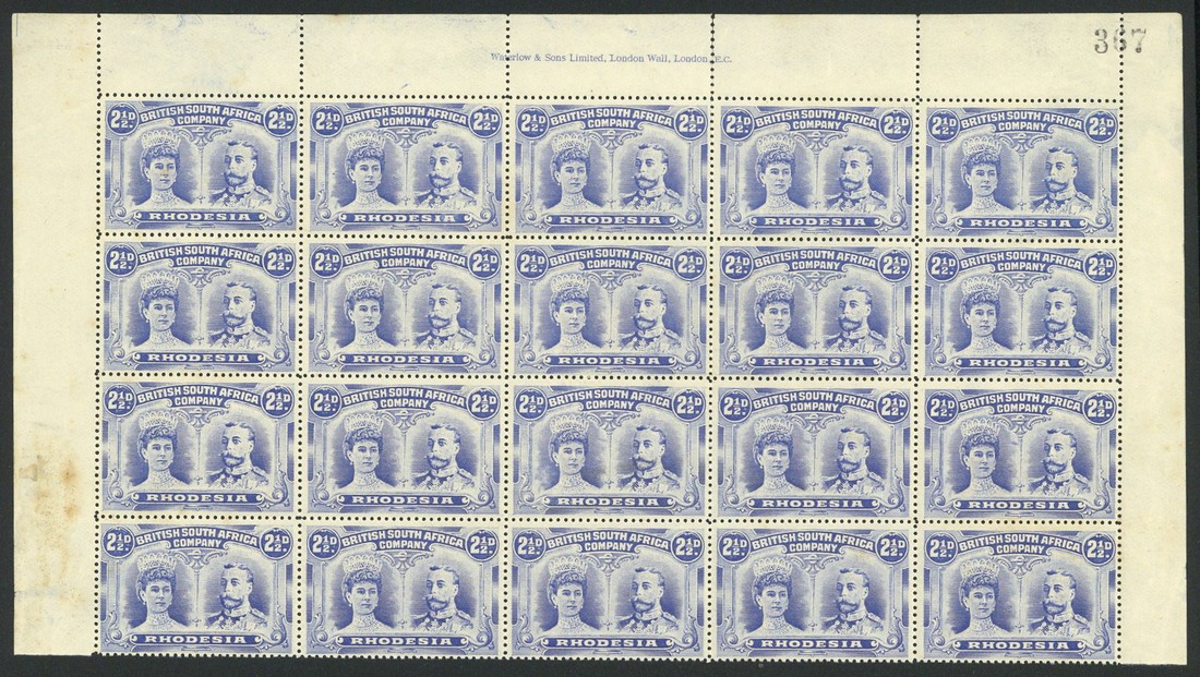 2½d. ultramarine block of twenty (5x4), being the top four rows of sheet number "367" with full sheet margins and imprint, part patchy gum; a few split perfs. between two vertical rows, four stamps with small thins and a couple of small fox marks. S.G. 172, £1,500