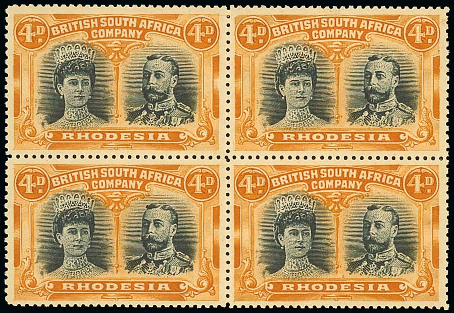 4d. blue-black and dull orange block of four, [HP29-35], lightly mounted mint with the lower pair remaining unmounted; trace of a gum crease. Scarce. RSC "C". Photo