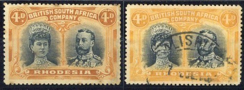 4d. black and orange, part original gum; some tone spots. Also perf. 15 black and yellow-orange with gash in ear, used with Salisbury c.d.s.; perf.13½ 8d. grey-purple and dull purple, large part original gum; faint perf. tone, otherwise fine and perf.15x14 3d. unused (faults). (4)