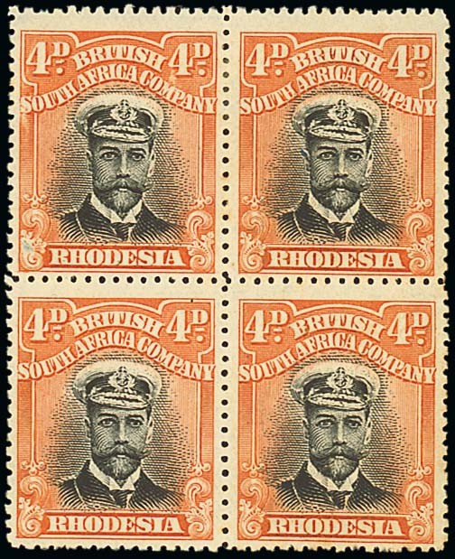 4d. black and orange-red block of four, large part original gum with the lower pair remaining unmounted; upper left stamp with small surface abrasion at lower left corner, a couple of perforation tones. A scarce multiple. S.G. 216, £680+. Photo