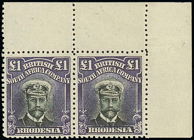 £1 black and violet upper right corner pair, both with handpainted cap, fresh mint with the hinge marks in margin barely affecting the stamps; fine and scarce. S.G. 243, £850+. Photo