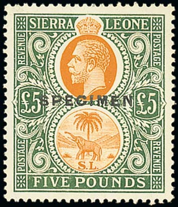 1921-27 Script £5 orange and green overprinted "specimen" (Type D16), part original gum, hinge remainder, fresh and fine mint. S.G. 148s, £425. Photo