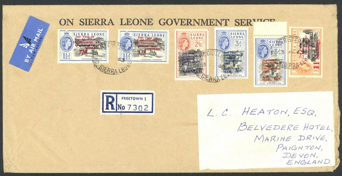 11s. on £1 black and orange used with Air 7d. on 1½d., 1/3d. on 1½d., 2/6d., 3s. on 3d. and 6s. on 3d. on 1963 (3 May) OSLGS envelope (254x127mm) registered from Freetown to England, the 11s. with two very lightly discoloured perfs at left, otherwise fine. B.P.A. Certificate (undated). S.G. 269, £250
