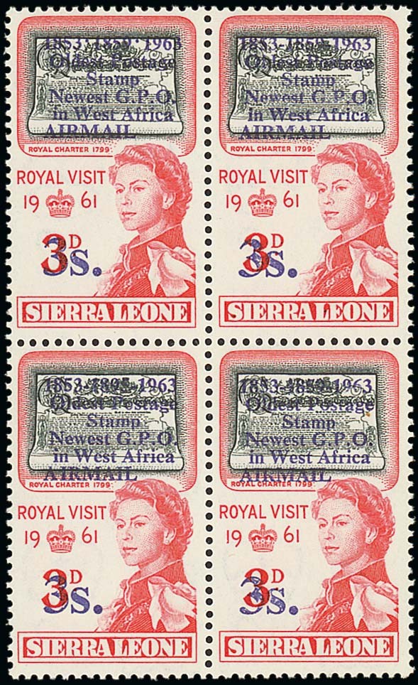 3s. on 3d. black and rose-red block of four, the lower left stamp showing variety "1895" for "1859" (R. 3/3), fine unmounted mint. S.G. 282a, £450. Photo
