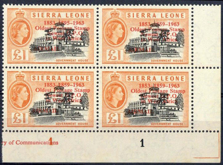 £1 black and orange lower right corner block of four with plate numbers and part imprint, a few light tones on reverse of selvedge otherwise fine unmounted mint. S.G. 284, £140