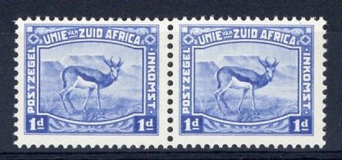 1925 Harrison Springbok 1d. essay, unscreened perf. 14 pair in blue, and 1929 1d. Ship Darmstadt trials pair on ungummed unwatermarked paper and a gummed marginal pair without vignette on watermark Quatrefoil paper; fine