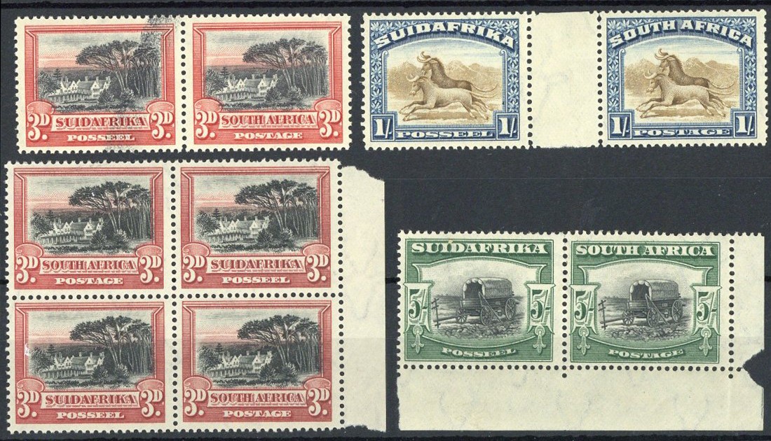 1927-30 perf. 14 marginal block of four and 5/- lower right corner pair showing oval perf. holes at right, perf. 14x13½ 3d. pair with one showing black colour wipe and 1/- interpanneau pair, all with watermark upright, good to fine mint. Cat. £487