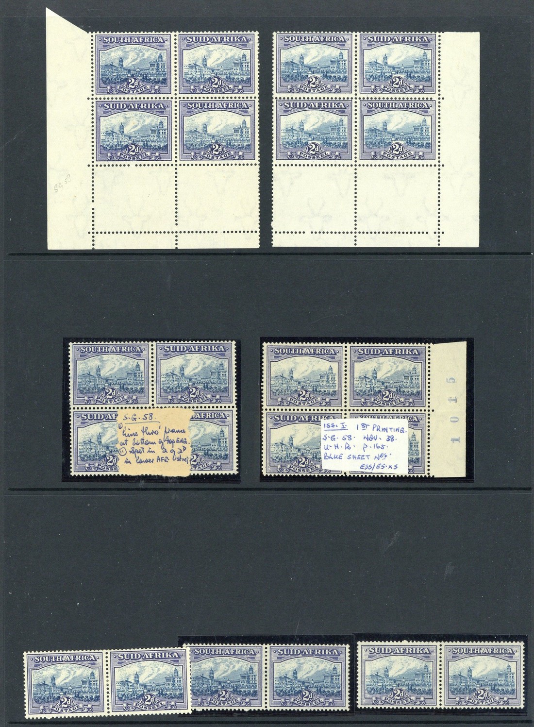 — 2d. blue and violet group, comprising lower left and lower right corner blocks of four, two further blocks of four, one showing blue sheet number and pairs (3), large part original gum or unmounted mint