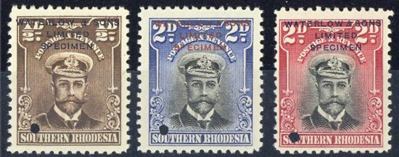 ½d. brown, 2d. black and ultramarine and 2d. black and carmine Waterlow Sample stamps, each overprinted "waterlow & sons/ limited/specimen" and with a small security; fine