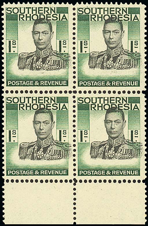 1/- black and blue-green marginal block of four from the foot of the sheet, variety vignette misplaced to upper right, fine unmounted mint. Dramatic. Photo