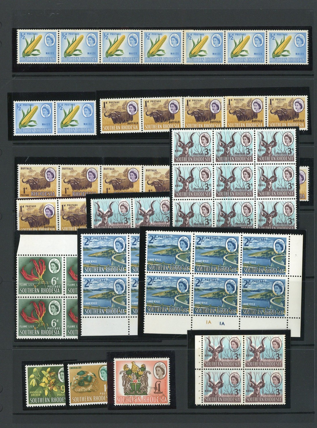 ½d. to £1 selection of fourteen items (67 stamps), largely with varieties and including ½d. and 1d. coil strips with joins, 3d. (2, one a booklet) blocks of four with blue colour shift, 3d. block of twelve with "doctor blade" flaw at centre, 6d. marginal block of six (3x2) with top row showing paper crease, 2/- Plate 1A blocks of six (2, one with ochre colour shift) and £1 (used) with minor shift of brown printing, fine and all the mint unmounted