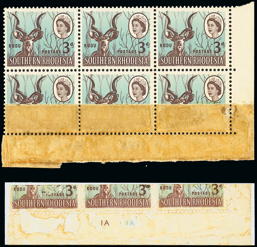 3d. lower right corner block of six (3x2), the lower row with variety joined paper using sellotape which has separated and left an impression on the tape. A unique and striking multiple originally purchased from the Que Que Post Office. Photo