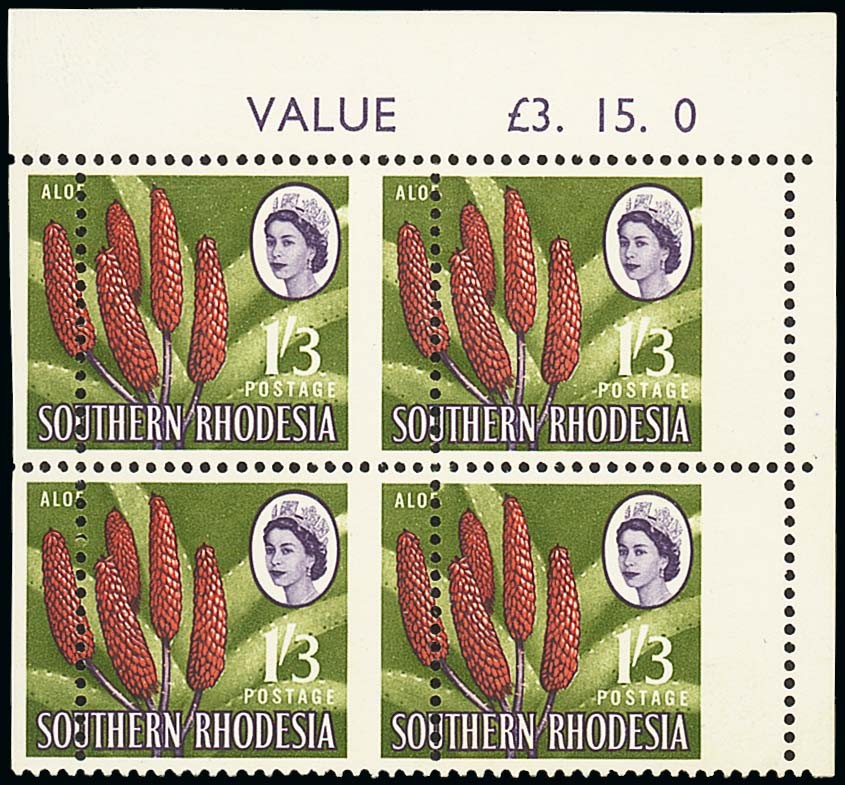 1/3d. upper right corner sheet value block of four showing dramatic perforation shift 6mm. to the right giving "imperforate" vertical sides, mounted in margin only; fine and very rare with only one sheet of this variety known. Photo