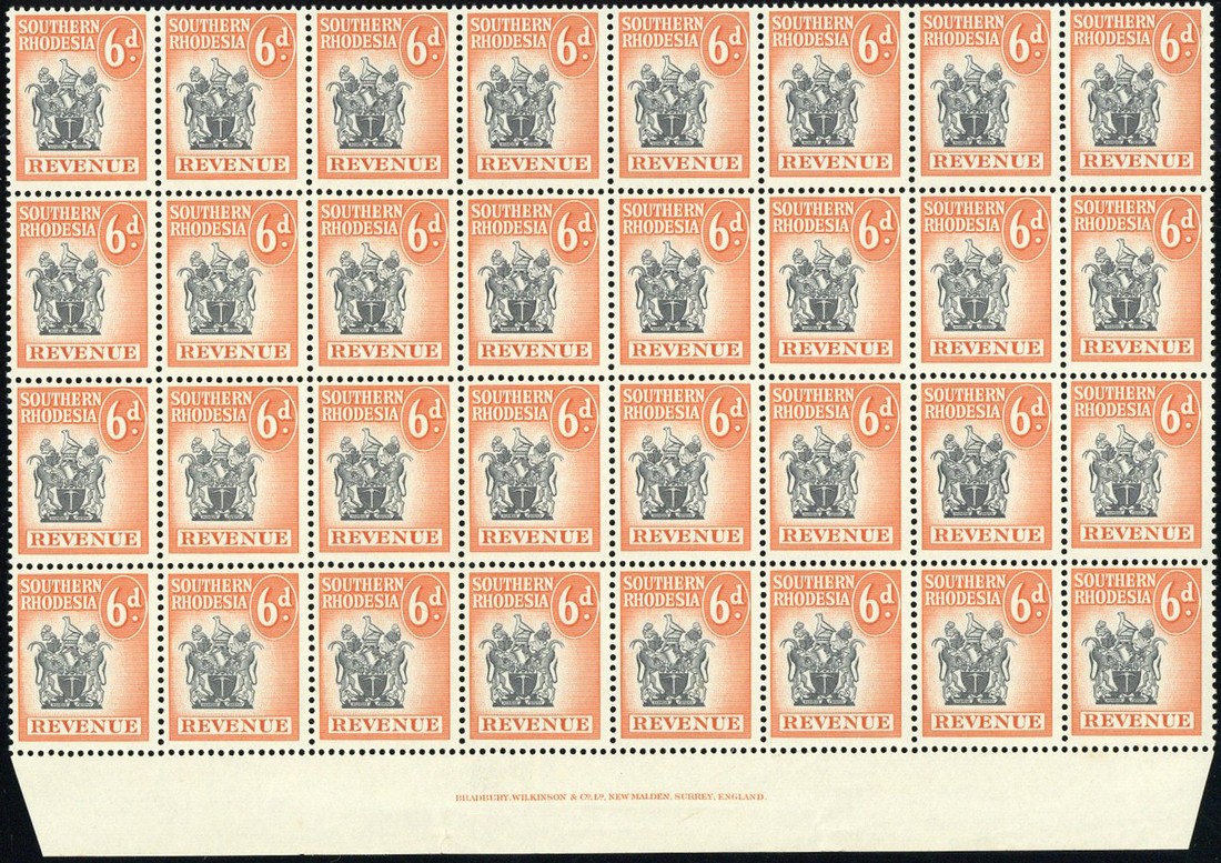 revenue: 1952 6d. black and orange block of four with shift of vignette to left, corner blocks of ten (20 with plate number and sheet number "110", corner block of fifteen with sheet number "007" and a marginal block of thirty-two with full imprint; fine unmounted mint/ Mewett 306