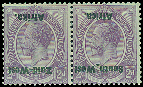 1923 (Jan.-June) Setting I, 1d. red horizontal mint pair with one showing "Af.rica", colour discharge at foot of both, 1d. red horizontal used pairs (2), one (on piece) showing "Wes." for "West", the other showing broken "r" in "Africa.", and 2d. dull purple horizontal pair, variety overprint inverted, large part original gum; a few perfs. severed at top, otherwise fine. Scarce
