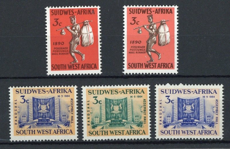 1964 Opening of Legislative Assembly Hall 3c. (3) and 1965 75th Anniversary of Windhoek 3c. (2), colour trials in close to issued colours on gummed watermarked paper; fine and attractive. Rare. SACC R6,200