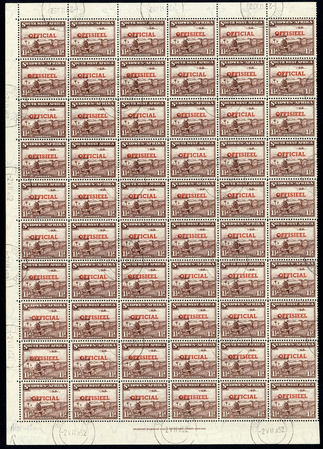 — 1½d. purple-brown complete sheet of sixty (6x10) less right-hand margin, the lower half of the sheet with transposed overprints, neatly cancelled by Windhoek 1952 c.d.s. S.G. O25, 25a, £1,905+