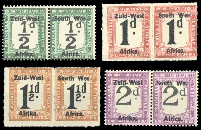 — Setting I on South Africa Pretoria printings, ½d., 1d., 1½d. and 2d. horizontal pairs with one in each showing "Wes" for "West", fresh mint; the ½d. normal with a crease and ink mark on reverse, otherwise fine. S.G. D6c, 7a-9a, £560