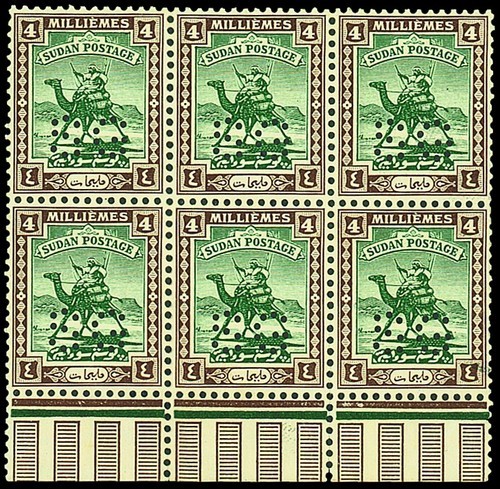 1930 4m. green and chocolate marginal block of six (3x2) from the foot of the sheet, fresh; a couple with small flat marks on gum, otherwise fine unmounted mint. A scarce multiple. S.G. O26, £540+
