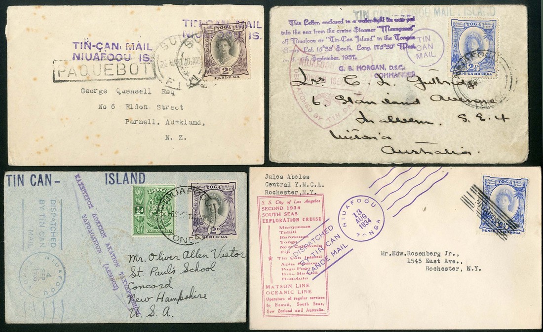 1930-82 Tin Can Mail collection of over 60 covers and cards, including outgoing mail with 1930, 1934 (6), 1935 (10), 1936 (11), 1937 (13), 1938 (8), 1939 (4), 1942, 1944 (2), 1947 (2), incoming mail from Australia, Great Britain (1935 and 1939), New Zealand (1930 and 1937), United States (1935, 1939 and 1940), etc., chiefly good to fine with a variety of cachets, frankings, etc.