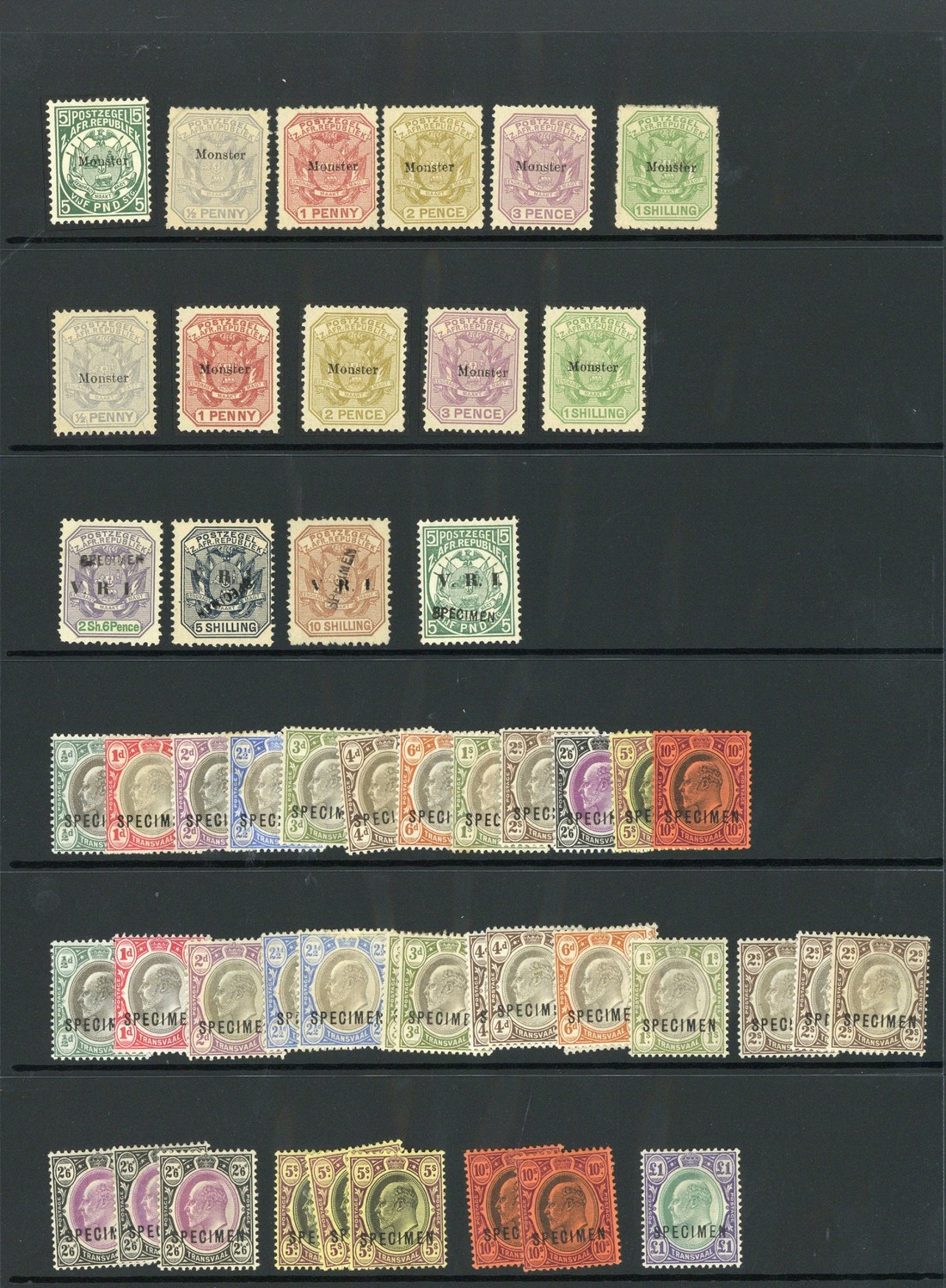 1885-1909 selection (83) with some duplication including 1885 £5 deep green, 1895-96 ½d. to 1/-, 1900 2/6d. to £5 and 1903 1/- to £5 each overprinted or handstamped "specimen" or "monster", part to large part original gum, a few minor faults, generally good to fine. S.G. between 187s and 276s, £2,050