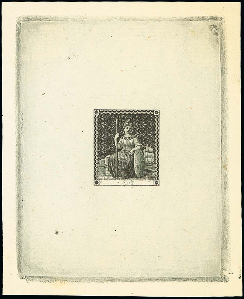 1851 Britannia master die proof in black on die sunk wove paper (58x85mm.), believed to be non-contemporary; very fine. A rare and important proof, the design for which was used for Barbados, Mauritius and Trinidad. Photo