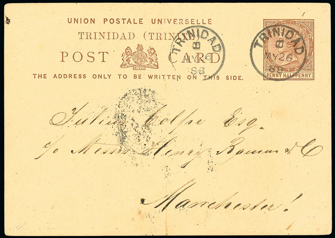 1888 (24 May) 1½d. brown card used from Cuidad Bolivar to England, showing faint "royal mail" handstamp and cancelled at Trinidad (26.5) in transit and showing, on reverse, a light double strike of the "forwarded by/j.n. harriman & co./trinidad, b.w.i." serrated-edged oval handstamp in purple; central vertical fold, otherwise fine. Photo