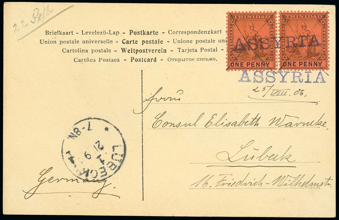 1906 (25 Aug.) postcard to Germany, bearing 1901 1d. (2) each cancelled by pen cross and sharing a fine strike of the Hapag S.S. "assyria" handstamp in purple with a further strike below, Lubeck arrival c.d.s. (12.9) at left; scarce. Photo