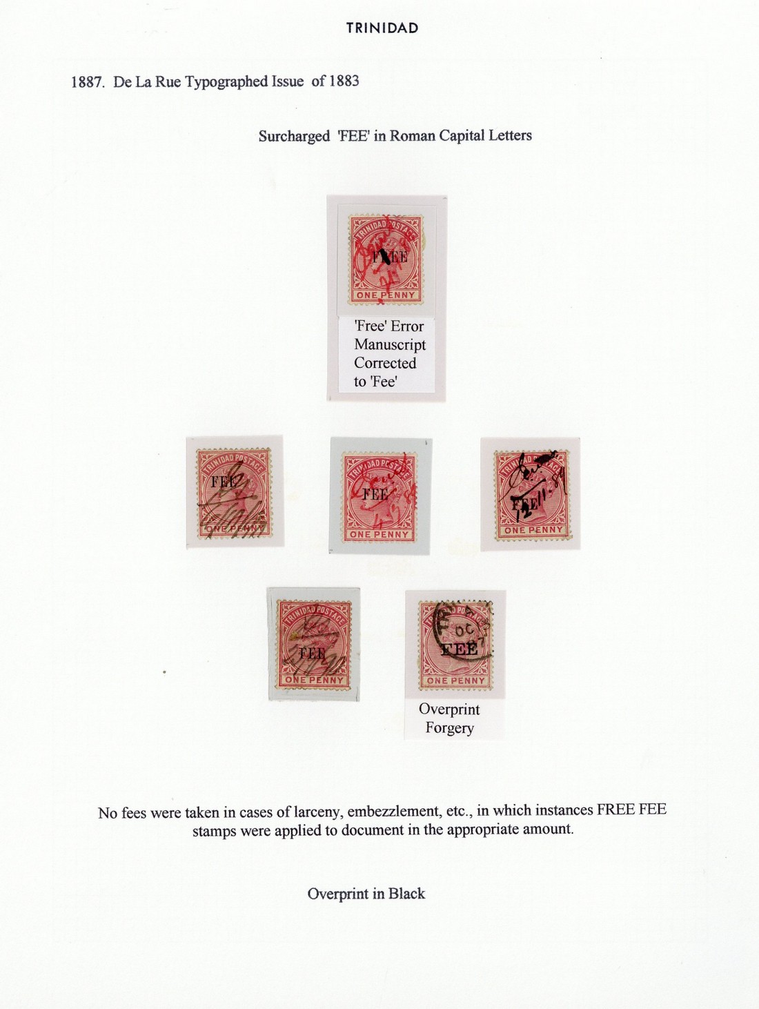 1887 overprinted "fee" in seriffed type on 1883 1d. carmine, five examples with manuscript cancellations, one with error "free", the "r" deleted in manuscript; also a forged example of the overprint. A scarce group. Barefoot 1, 1a