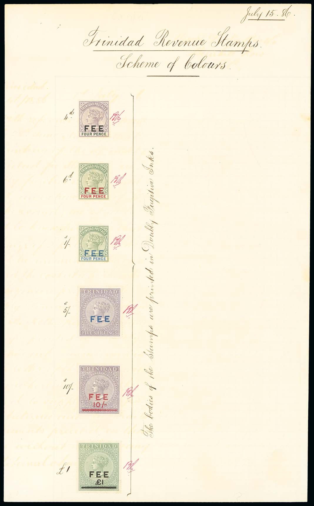essays: 1886 (15 July) "Scheme of Colours", comprising 4d. (3) and 5/- colour trials with each trio overprinted in black, red and blue and affixed to Appendix sheet (195x315mm.) with suggested values between 4d. and £1; a unique record. Photo